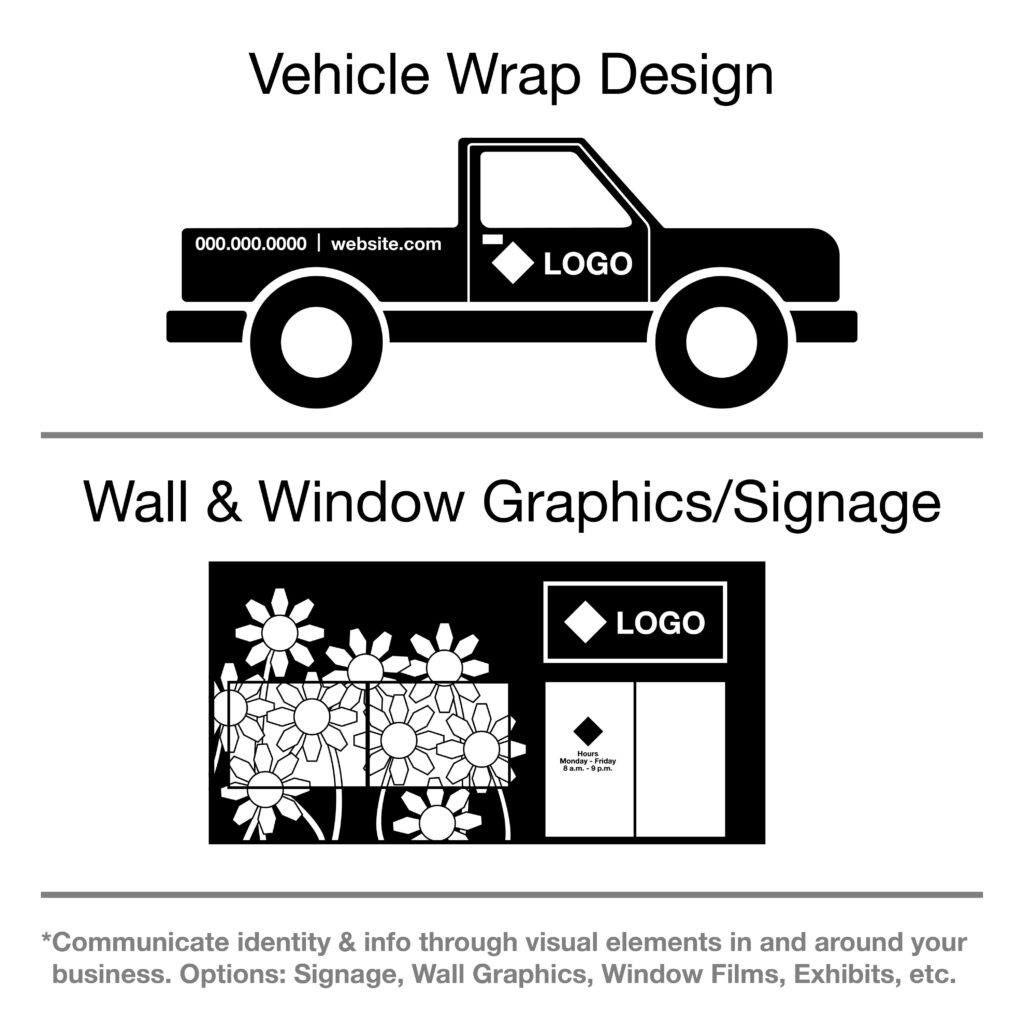 Offerings include: Signage, Vehicle wrap design, Window art, Safety signage. Includes two rounds of revisions at no extra cost.