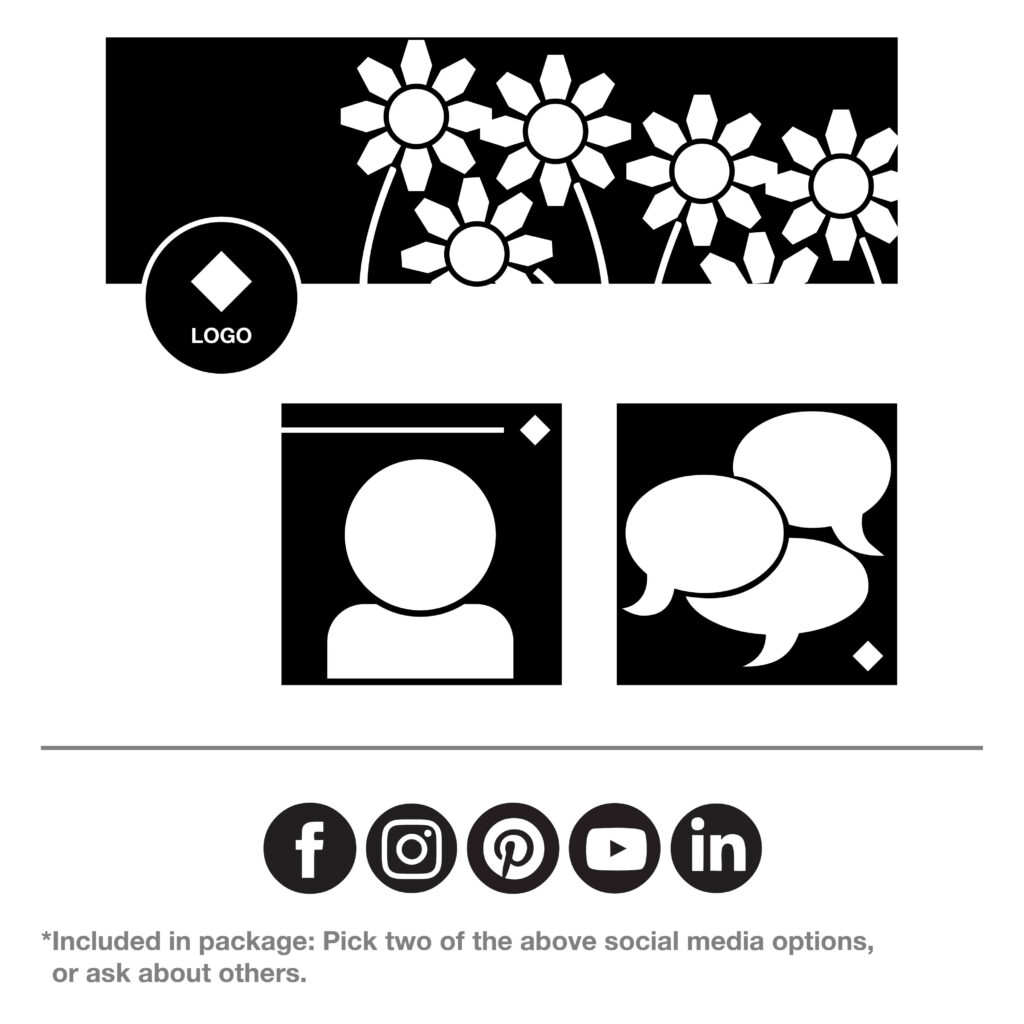 Choose from two social media sets, or add on as needed! Includes logo, cover image, and two branded post graphics set to the specification sizes of the chosen social media sites, and instructions on how to load/use them. Options include: Facebook, Instagram, Pinterest, YouTube, LinkedIn, etc. Includes two rounds of revisions at no extra cost.