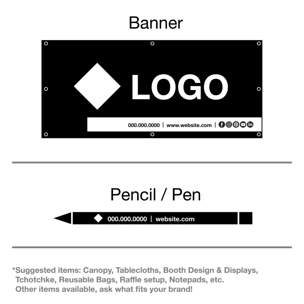 Offerings include: Banner, Swag/Merchandise, Flyer, Table pieces. Includes two rounds of revisions at no extra cost.